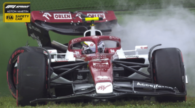 24直播网04月24日讯 ,F1意大利伊莫拉大奖赛冲刺赛,这是周冠宇F1生涯首度参加冲刺赛,前8名获得积分。一个赛季下来也只有3场冲刺赛,可惜的是周冠宇失控撞墙,随后赛车停在了缓冲区,赛会出动安全车,光速结束比赛。这是第一圈,周冠宇被加斯利顶到后赛车失控撞墙,随即结束比赛,加斯利更换前翼后重新加入比赛。