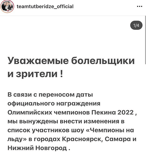 K宝和千金从冬奥会归来之后并没有太多休息的时间,两人都参加了“1TV杯”跳跃大赛和团体赛,之后又去往明克斯参加冰演,回到莫斯科也表演了一场,没有得到足够时间的休息,所以接下来的三场冰演,千金和K宝不会参加。