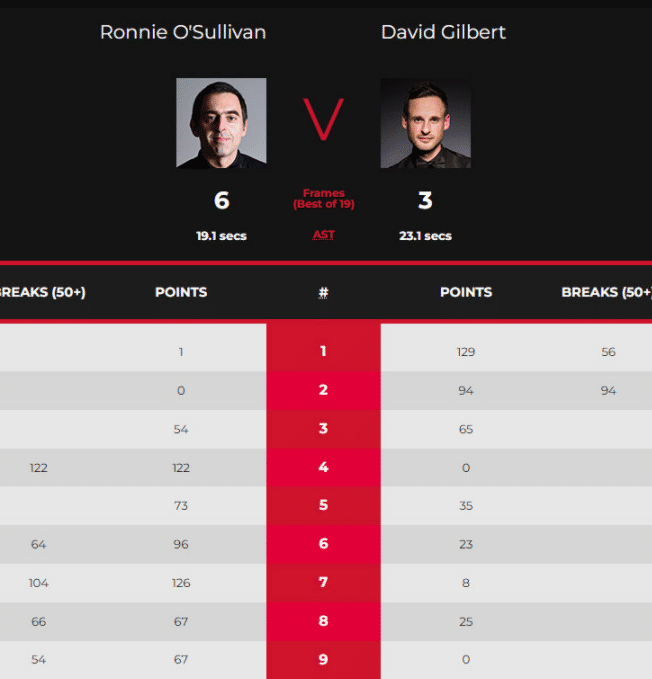 奥沙利文如梦初醒。第4局打出单杆122分,非常流畅。下半场,比赛完全进入奥沙利文的节奏,除去第5局73-35艰难拿下之外,奥沙利文随后接连打出单杆64分、104分、66分和54分,以连胜6局的姿态,结束第一阶段的全部比赛,最终6-3大比分领先。