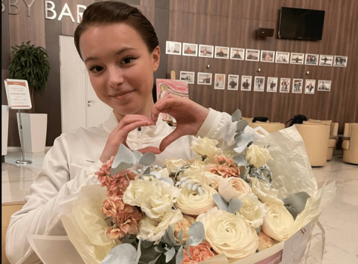 在巡演结束后,千金谢尔巴科娃也在社交媒体上晒出了自己手捧鲜花的照片,并且写道:“们巡演的第一场结束了,谢谢明斯克。”并且给冰迷们比了一个心。除此之外,谢尔巴科娃还专门更新了自己的中文社交媒体,晒出了自己两套服装。