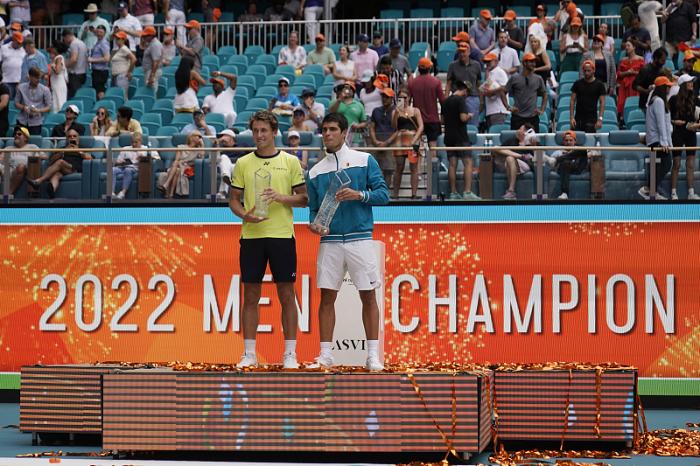 24直播网04月06日讯 上周日,18岁的阿尔卡拉斯成为迈阿密公开赛历史上最年轻的冠军,也是史上第三年轻的大师赛冠军得主。这一胜利对这位西班牙人来说是一个星光闪耀的赛季开始,他之前也成为了里约热内卢ATP 500赛事历史上最年轻的冠军。目前,他已经在对阵前10名选手中取得了7场胜利。这位世界排名第11的选手被誉为未来的世界第一,有一天他很可能会取代他的偶像纳达尔成为西班牙网球的领袖。尽管纳达尔目前没有打算在短期内退役,但一位前大满贯决赛选手相信,他的年轻同胞会刺激纳达尔在巡回赛上更加努力。