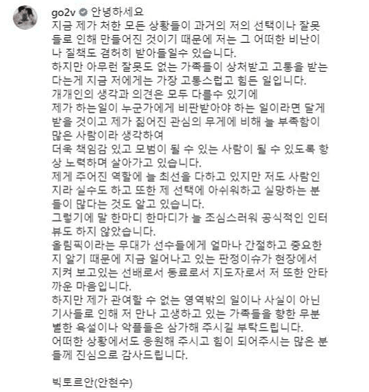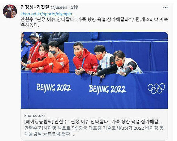 中国短道速滑队技术教练的安贤洙更是因为韩国网友的网曝发声,安贤洙是男子短道速滑历史上最好的运动员之一,也是韩国队的传奇,后期代表俄罗斯出战索契冬奥会斩获三金,如今来到中国队执教。因为韩国队成绩糟糕,而中国队的成绩不俗,所以很多韩国网友在社交媒体上对其家人进行无差别的辱骂或恶意留言,而这也明显给安贤洙和他的家人带来了影响。