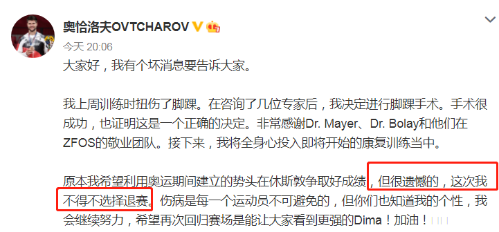 今天,奥恰洛夫宣布退出世乒赛,他在社媒上写道,“大家好,我有个坏消息要告诉大家。我上周训练时扭伤了脚踝,在咨询了几位专家后,我决定进行脚踝手术。手术很成功,也证明这是一个正确的决定”。