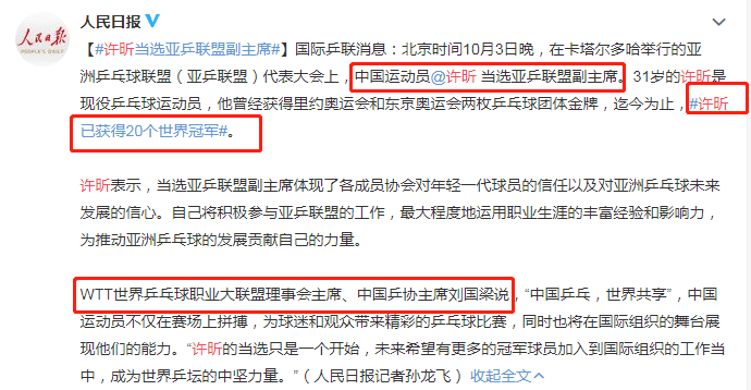 而人民日报也聚焦报道该消息,可见,许昕新官上任,对于中国乒乓球项目来说,都是非常重要的时刻:据国际乒联消息,在卡塔尔多哈举行的亚洲乒乓球联盟代表大会上,中国运动员许昕当选亚乒联盟副主席。