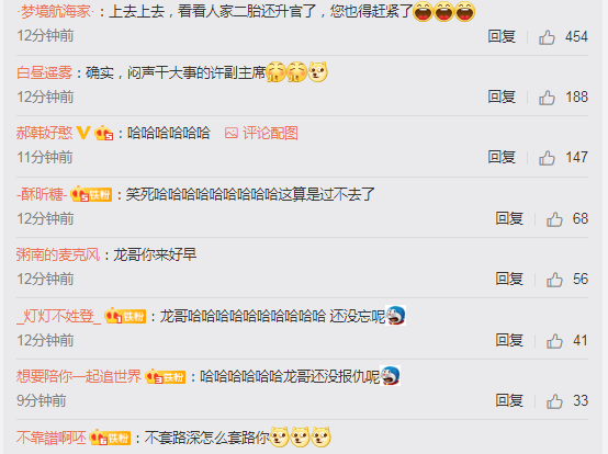 很多网友也纷纷发表自己的看法,“确实,闷声干大事”,“笑死了,这算是过不去了”,“龙哥,你来好早”,“哈哈哈,龙哥,还没报仇呢”,“不套路深怎么套路你”。