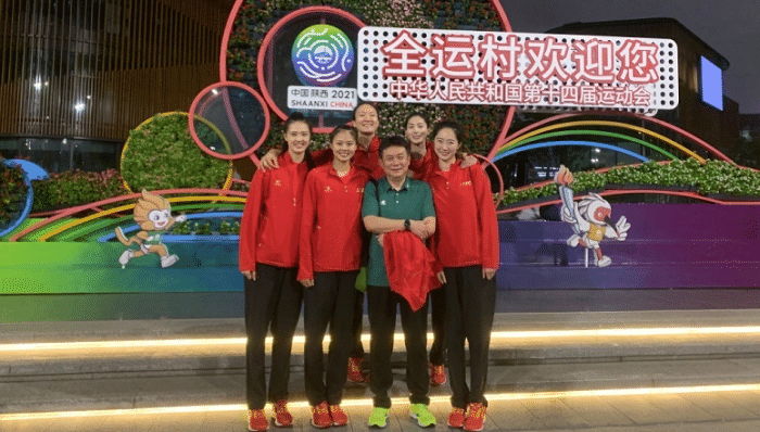 还有张常宁与主帅蔡斌、龚翔宇等人在亚运村前面合影,这也是标志性的地方,来到全运会的,几乎没有人不在这里进行合影。