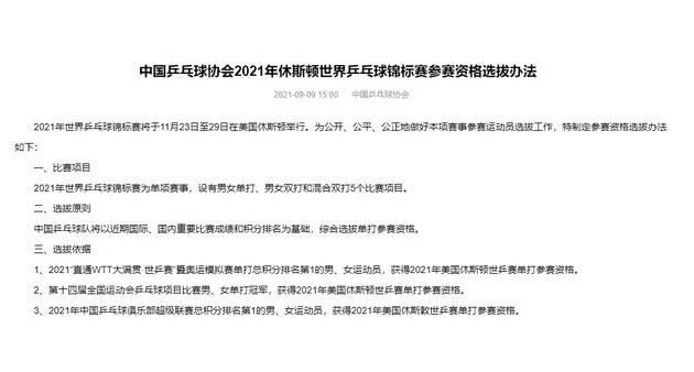 24直播网9月09日讯 下午,中国乒乓球协会公布了世乒赛的参赛资格选拔办法,奥运会之后,国际大赛最重要的就是世乒赛了,在9月份的全运会结束之后是10月份的乒超联赛,世乒赛则是在11月23日至29日在美国休斯顿举行,如今参赛运动员选拔规则已经出炉。