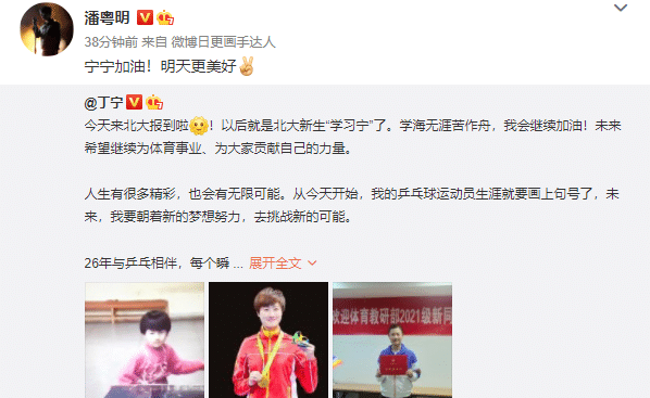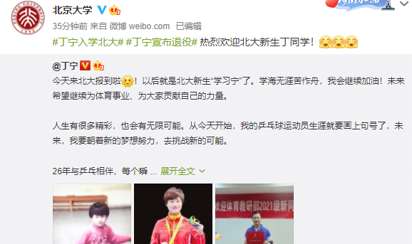 24直播网讯 北京时间9月6日,乒乓球大满贯得主丁宁在社交媒体上宣布退役,正式结束自己的乒乓球运动生涯,将会入学北大,开启学业。已经31岁的丁宁最近两年逐渐淡出人们的视线,她没有参加东京奥运会,而是在新媒体担任乒乓球的嘉宾,表现的落落大方,举止非常得体。如今的丁宁已经31岁,对于职业生涯乒乓球运动员来说,这已经是不年轻的年龄了,所以丁宁决定结束辉煌的运动,开启新篇章。