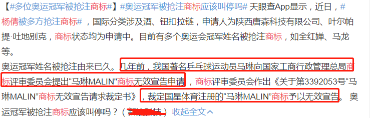 除了全红婵,杨倩之外,乒乓球世界冠军马龙的名字,也被注册成商标。可以预知的是,如果这种行为不尽早制止的话,会有更多的无良商贩,会利用奥运冠军来获得利益。