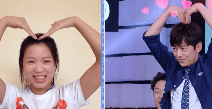 杨倩的标志性动作是比心,首金之后的颁奖典礼上杨倩也做了这个动作,何炅让杨倩选择现场录制节目的人一起比心,杨倩选择了何炅,何炅称这是自己巨大的荣幸。随后两人在音乐的节奏下比心,卡点比心的工夫也是很强。何炅是做娱乐节目的,所以节奏非常好,而奥运会双金王杨倩也是丝毫不落后,也还是各种花式比心,很显然这个动作也是她最喜欢的。