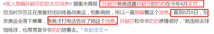 24直播网讯今天,一则热搜真的让人泪目了。奥运会乒乓球女团金牌得主孙颖莎的奶奶在今年4月份去世,而为了让孙颖莎专心备战东京奥运会,她的爸爸决定隐瞒孙颖莎,直到今年8月8日,东京奥运会结束后,孙颖莎才得知这个消息。为了今年的东京奥运会,孙颖莎和她的家人都付出了很多。