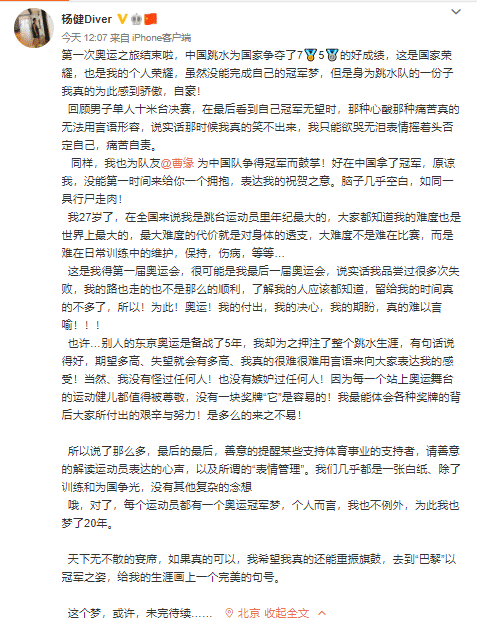 之后杨健还谈到了自己已经27岁了,是跳台跳水年龄最大的,世界第一难度的代价是对身体的透支,大难度不是难在比赛,而是难在日常训练中的维护,保持,伤病,等等。同时杨健还表示这很有可能是自己的最后一届奥运会了,别人是备战了5年,自己是赌上了整个职业生涯,也希望可以在3年之后去到巴黎