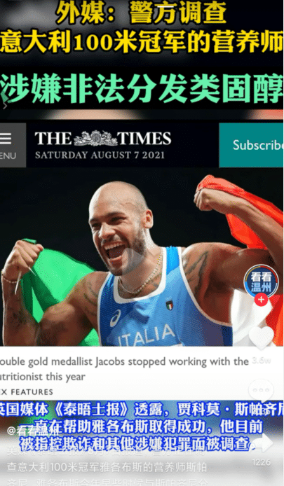 据媒体报道,意大利短跑名将雅各布斯的营养师被指控涉嫌非法分发类固醇,这名营养师已被调查!据悉,该名营养师在很长一段时间内给一些运动员提供“能量”以帮助他们提高成绩。