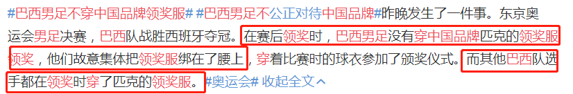 据报道,在赛后的颁奖典礼上,巴西男足登上领奖台,但意外的是,球员们拒绝穿中国品牌服饰去领奖。据悉,中国某运动排品牌是东京奥运会巴西队的赞助商,按照契约,巴西球员需要穿着中国品牌去领取金牌,但他们却没有这么做,被认为是吃饭砸锅的表现,连金主的面子也不给。