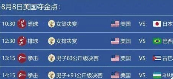 美国队在最后1天的夺金点有奥运女篮决赛,美国女篮的对手是东道主日本队,实力碾压,但要考虑到主场因素;奥运会女排决赛,美国队的对手是巴西队,巴西队是08和12年奥运会冠军,美国女排从未拿下过奥运会的金牌。同时美国队还有拳击两个项目是夺金点。