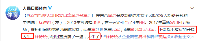 而徐诗晓的经历,连权威媒体人民日报都发表感慨之词。《人民日报体育》官方社媒写道,“在东京奥运会皮划艇静水女子500米双人划艇夺冠的中国选手徐诗晓,2013年曾选择退役,在一家企业当了4年HR。2017年重新复出回到赛场,两年拿到世锦赛冠军,3年拿到奥运冠军。小说都不敢写的开挂人生,徐诗晓直接演了一遍,太牛了”。