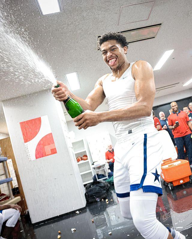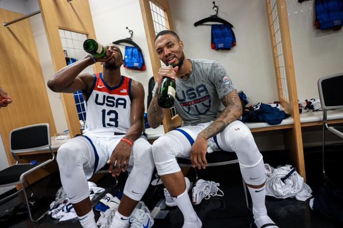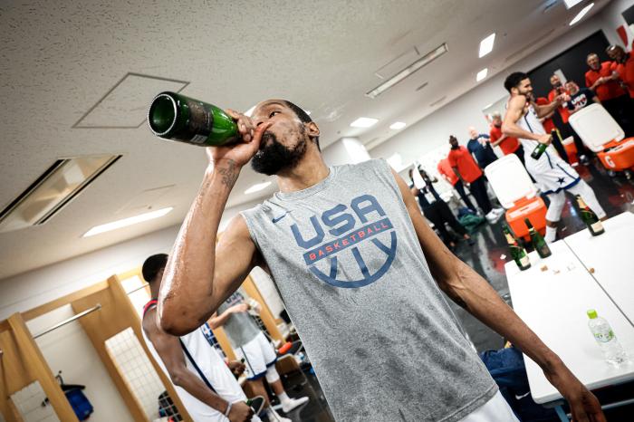 24直播网讯 北京时间8月7日,美国男篮87-82战胜法国夺得东京奥运金牌,从而实现奥运四连冠的伟业,杜兰特则是收获个人第三枚金牌;赛后回到更衣室,美国男篮全队狂喷香槟庆祝,杜兰特、利拉德和阿德巴约等球员都是直接对瓶吹,狂饮香槟太嗨了。