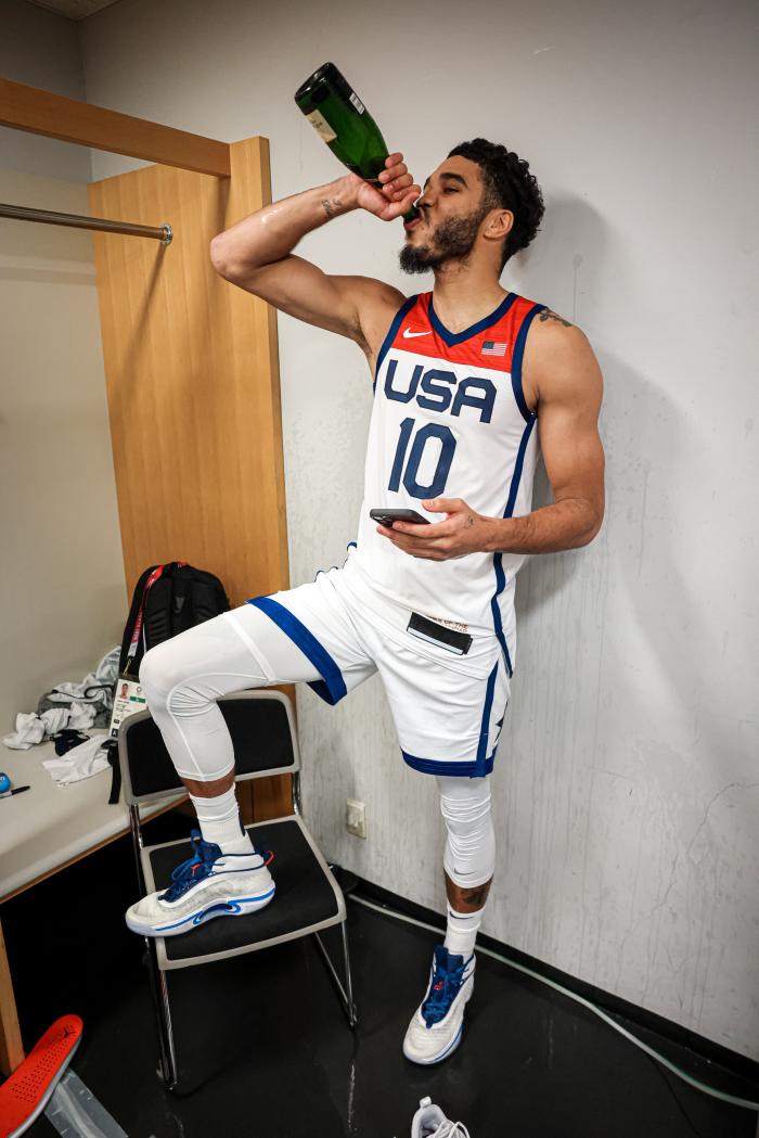 美国男篮官方晒出全队疯狂庆祝的画面,更衣室瞬间变成他们的狂欢派对,麦基赤膊喷洒香槟,塔图姆和凯尔登-约翰逊也尽情享受胜利的喜悦;塔图姆转发狂欢照,发推:我们永远联系在一起。