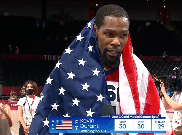 在决赛中,杜兰特再次开启杀神模式,全场轰下29分6篮板带队夺冠从而实现个人三连冠,关键时刻两罚终结比赛,此前在12年伦敦奥运会和16年里约奥运会,杜兰特都在决赛中轰下30分带队夺冠。