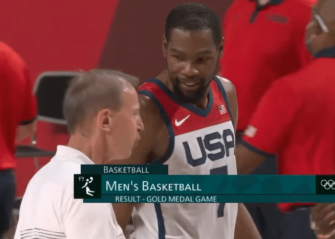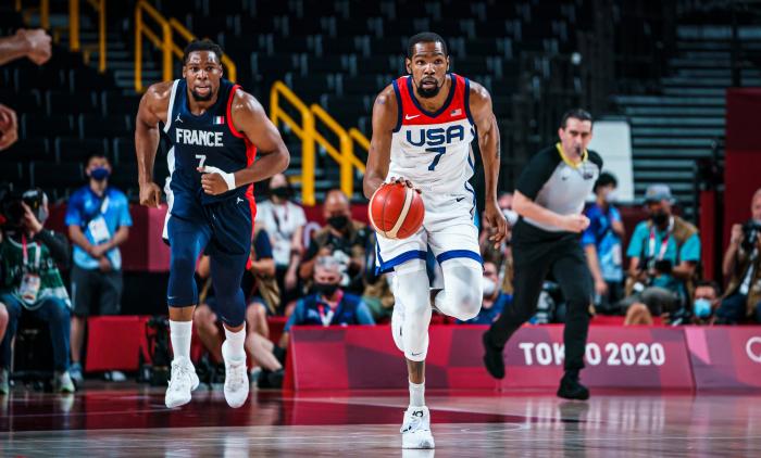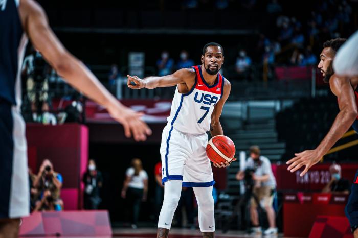 1/4决赛,美国队95-81大胜西班牙,杜兰特17投11中狂砍29分,中投和三分都十分无解;半决赛逆转澳大利亚,杜兰特19投10中拿到23分9篮板,布克爆发贡献20分。
