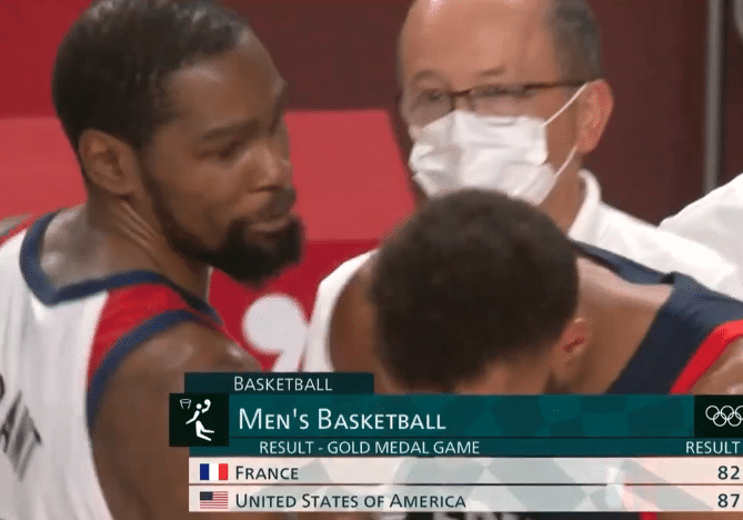 24直播网讯 北京时间8月7日,东京奥运会冠军正式诞生,美国男篮87-82战胜法国夺得东京奥运男篮金牌,美国男篮实现奥运四连冠伟业,杜兰特创造个人三连冠伟业;赛后戈贝尔哭了,杜兰特咧嘴大笑以及披国旗疯狂庆祝。