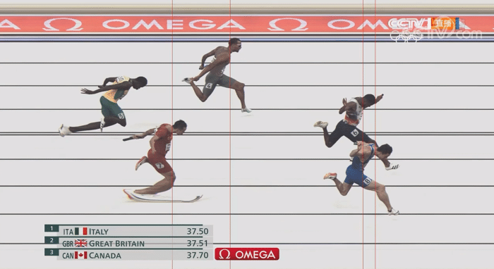 中国队的汤星强跑第一棒,谢震业是第二棒,苏炳添是第三棒,吴智强是第四棒。结果,中国队以37秒79获得了4×100米第4名。第1名是意大利队,成绩是37秒50,第2名是英国队,成绩是37秒51,第3名是加拿大队成绩是37秒70!