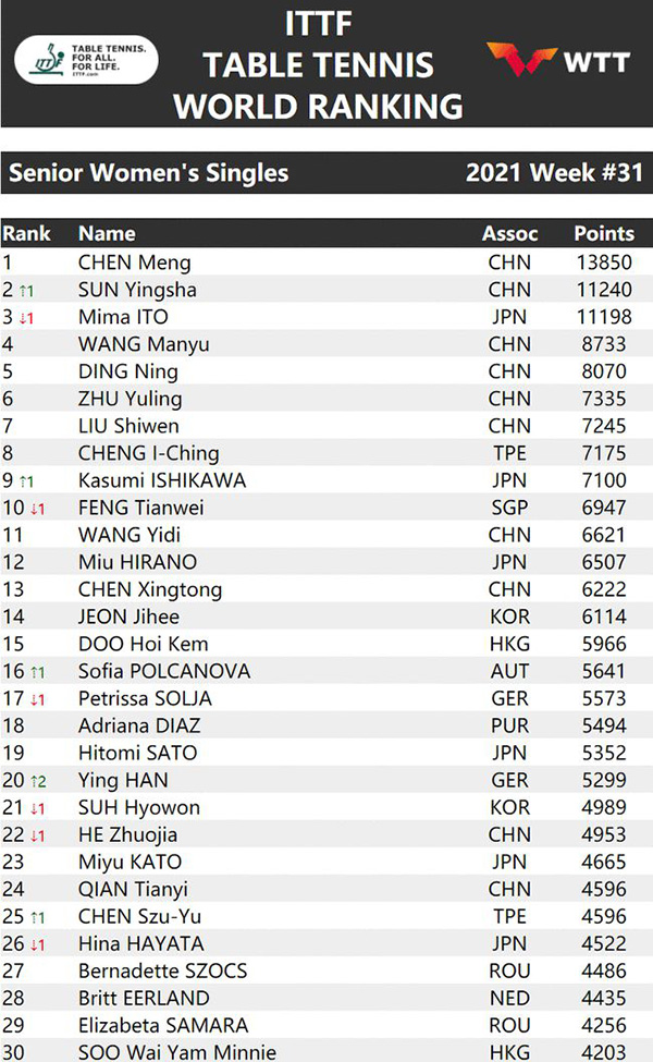 此前一直排名世界第一的陈梦,凭借奥运会冠军积分进一步巩固了自己的领跑优势。中国新生代主力孙颖莎则也向前跃进一步,将日本选手伊藤挤出前两名。不过尽管伊藤美诚名次下滑一位,但仍然领先第四名的王曼昱2000余分,短期内不会跌出前三。