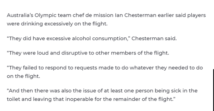 根据报道,澳大利亚奥运代表团团长伊恩·切斯特曼早些时候表示,运动员们在飞机上过度饮酒。“他们确实饮酒过量。他们大声喧哗,对航班上的其他成员造成了干扰。他们没有回应要求他们在飞机上做任何需要做的事情。还有一个问题是,至少有一人在厕所里呕吐,导致该厕所在飞机的剩余时间无法使用。”