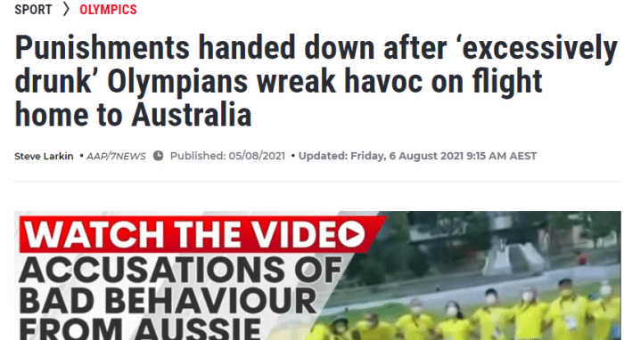 根据报道,在上周四离开东京、周五抵达悉尼的日本航空公司航班上,一些七人橄榄球队选手和赛艇运动员喝醉了,并违反了机组人员的命令。此外,在日本奥运村一个房间被澳大利亚运动员破坏。澳大利亚橄榄球协会相关部门调查了这次飞行和房间损坏情况。