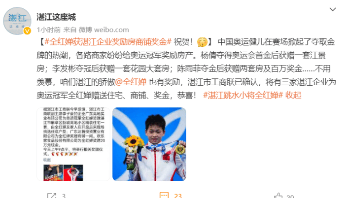 24直播网讯 北京时间8月6日消息,在东京奥运会斩获女子单人10米跳台金牌的14岁选手全红婵,获得了广东湛江当地三家企业的奖励。三家企业分别奖励全红婵一套房子,一间商铺和20万奖金。