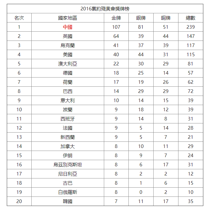 本届残奥会暂未开幕,让我们先来看看上届里约残奥会奖牌榜