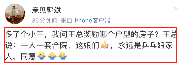 而王楠的老公郭斌也在社媒上支持妻子的决定。郭斌在社媒上写道。“多了个小王,我问王总奖励哪个户型的房子?王总说,一人一套合院,这娘们,永远是乒乓球娘家人,同意”。