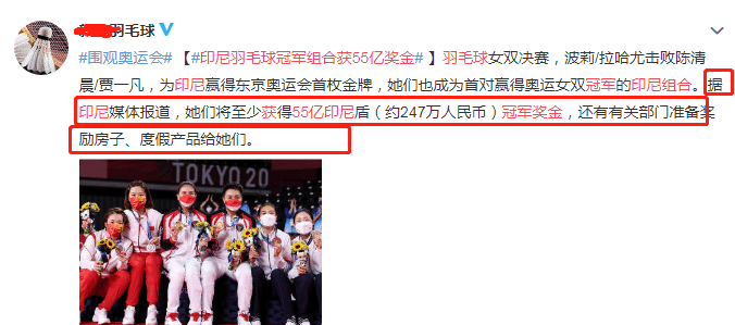 不得不说,印尼方面的奖励,实在太阔绰了,但波莉/拉哈尤组合也值得,她们在羽毛球场上拼尽全力,而且击败了强大的中国队,更是让这枚金牌显得弥足珍贵。