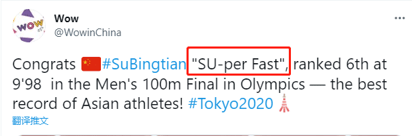 除了韩国网友之外,其他国家的田径迷也纷纷在社交账号上,热议作为亚洲选手的苏炳添本届奥运会出色的表现。一位田径迷甚至还为苏炳添起了一个新昵称:Su-per Fast,不仅有苏炳添名字中苏的拼音,还是super fast意指苏炳添“超级快”的速度,甚至暗含了so perfect的谐音含义。