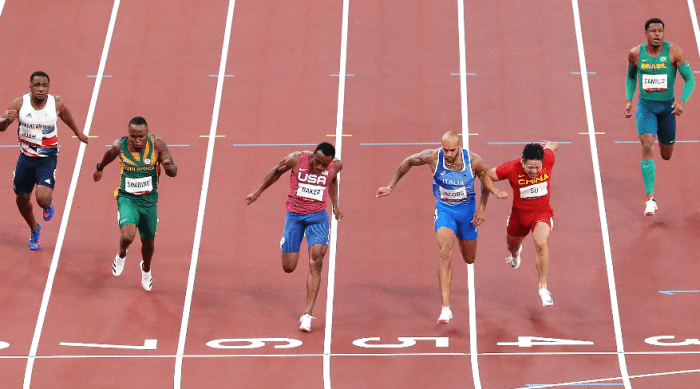 这场比赛苏炳添的决战可以说是万众瞩目,因为在决赛开始前的2个小时,苏炳添刚刚出战100米半决赛,跑出了9秒83的封神成绩,以千分秒的优势排名半决赛所有运动员的第一名,刷新个人、亚洲的纪录,晋级到决赛。所以决赛距离半决赛只有2个小时的时间,外界所有人的关注目光都放在了东京奥运会百米飞人大战的跑道上,大家也都期待看看苏炳添创造历史的一战。
