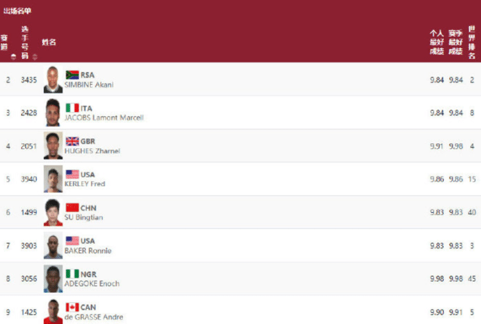 无数人为苏炳添的9秒83疯狂,但很显然我们依旧可以期待苏炳添做到更多,尤其是在他跑出了如此历史性的成绩之后。现在苏炳添晚上征战百米飞人决赛的道次也已经出炉,2-9道,苏炳添处于黄金第6道,他是以半决赛所有成绩第一的身份晋级到决赛的,千分秒击败贝克,所以处于最好的道次。
