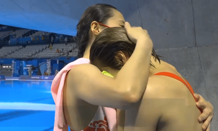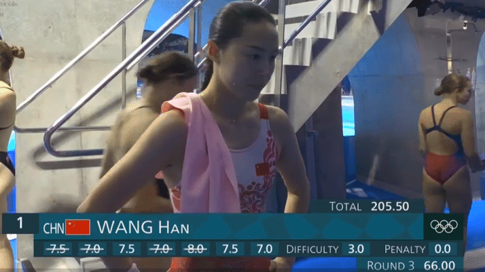 王涵第三跳66.00分,施廷懋第三跳75.00分,三轮过后,施廷懋总分228.00分排名第一位,大比分领先于第二名,王晗总分205.5分排名第二,美国选手帕尔梅204.0分排名第三紧追王晗,第四跳结束后,第一施廷懋305.50分,第二王涵275.25分,第三帕尔梅270.65分,最后一跳结束,帕尔梅343.75分夺得铜牌,王涵总得分348.75分夺得银牌,施廷懋383.50分夺冠,夺冠后掩面哭泣,对于这位老将来说,这也是她的奥运告别站,完美的谢幕,中国队实现了奥运9连冠。