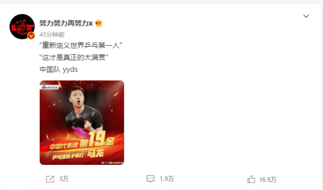 知名艺人张艺兴第一时间在社交账号上祝贺马龙获胜,他写道:“重新定义世界乒乓第一人!这才是真正的大满贯!中国队yyds!”