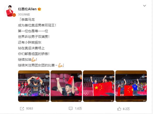 另外一位艺人任嘉伦也发文表示:“恭喜马龙!成为首位奥运男单双冠王!第一位也是唯一一位世界乒坛男子双满贯!还有小胖樊振东,站在奥运决赛场上你们都是祖国的骄傲!继续加油!我会继续关注男团女团的比赛!”