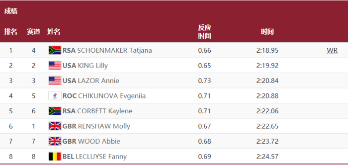 1997年出生的施恩梅克,此前在该项目游出的最好成绩是2分19秒16,也是在本届奥运会游出的。此番,她更是游出了世界纪录。在比赛中,莉莉金在前50米占据优势,但施恩梅克随后迅速完成反超。最后时刻,施恩梅克完全压着世界纪录在游,最终刷新了世界纪录!
