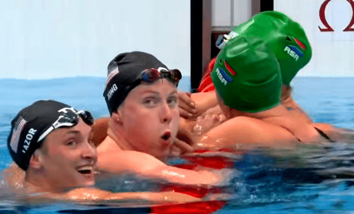 此时温暖的一幕发生了,她身边的南非队友以及美国两名选手莉莉金和安妮也游了过来,她们纷纷向施恩梅克表示庆祝。4名女孩拥抱在一起,场面非常温暖。此刻,她们的祝福一定是真诚的,世界纪录的产生,意味着人类在这个项目的极限,又一次被提升了,这就是竞速项目的终极意义。
