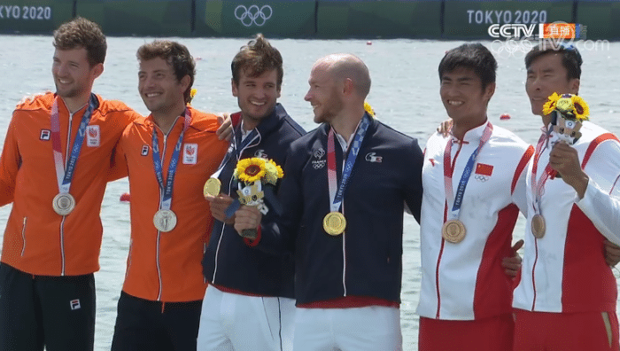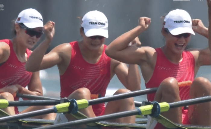 中国女子赛艇队时隔13年再次夺得女子四人双桨金牌,夺冠之后陈云霞、张灵、吕扬和崔晓桐四朵金花高举双手欢呼庆祝,更是打破该项目世界纪录,夺得中国女子赛艇队在该项目的首个境外奥运金牌。