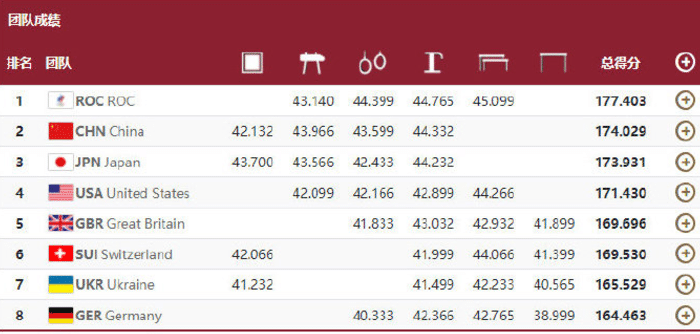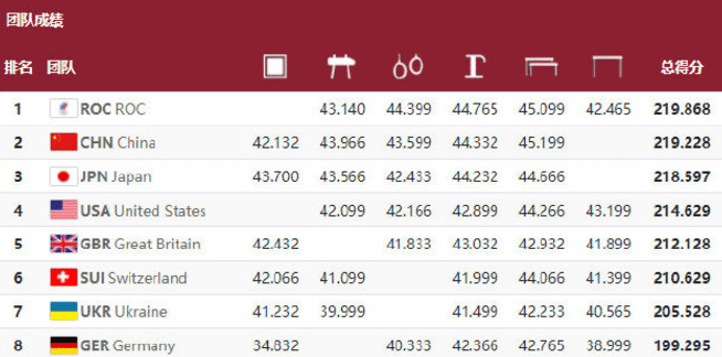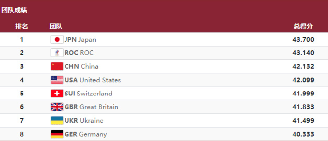邹敬园15.000分,孙炜14.233分,肖若腾14.366分,与第二名的日本队相差0.002分,微乎其微。