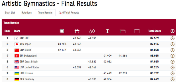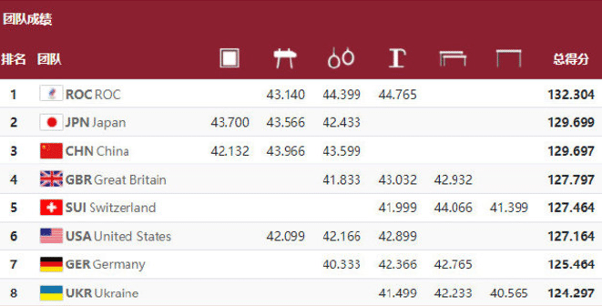 林超攀14.733分,孙炜14.866分,肖若腾14.733分,中国队成功反超日本队,但依据落后第一的俄罗斯奥委会队。