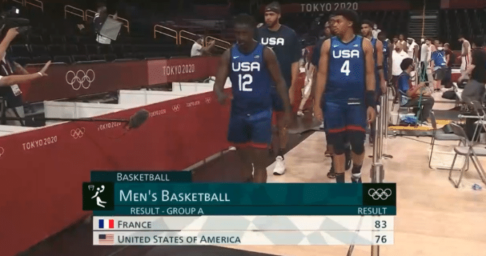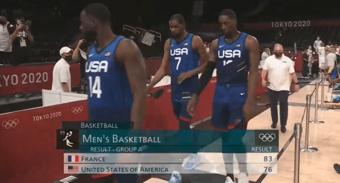 24直播网讯 北京时间7月25日,美国男篮东京奥运首战不敌法国,第三节11-25狂输14分被翻盘,末节一度再次领先,可关键时刻美国男篮集体掉链子,最后1分钟杜兰特、霍勒迪和拉文共计投丢四记续命三分,利拉德滑倒失误还赔上违体犯规,美国男篮遭遇耻辱一战。