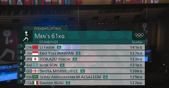 在抓举项目中,李发彬最大竞争对手,印尼老将伊拉万第一把试举137公斤,开把成功;第二把试举141公斤失败,第三把继续试举141公斤,又一次失败了;李发彬最后一个出场,开把试举137公斤,可惜蹲下之后没能站起来,开把失败;调整之后,李发彬回到场上,第二把继续试举137公斤,第三把试举141公斤,连续两把成功举起。
