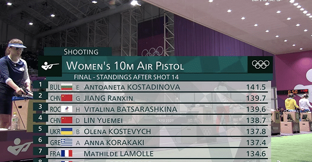 第二轮基础发过后,姜冉馨第四名,林月美第五名,她们之间相差0.2环。接下来就是两强淘汰一人的残酷比赛。14枪之后,姜冉馨升至第二名。