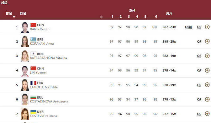 第一轮基础发打完,林月美和姜冉馨排在第三名和第四名,前两名的都是51.1环,中国队的选手和榜首之间的差距并不大。