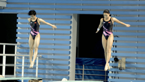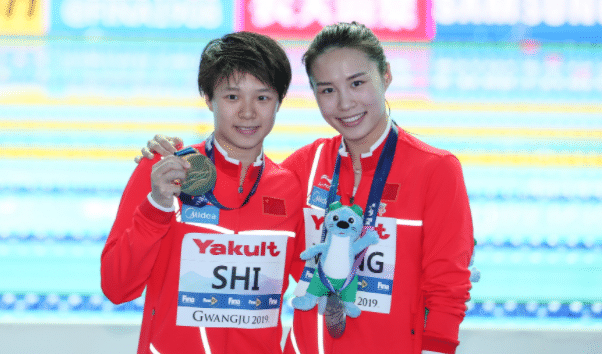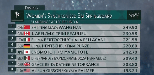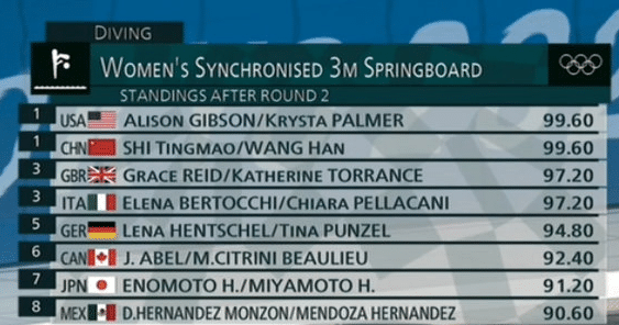 第二轮,施廷懋王涵反身翻腾1周半转体,得到49.8分,总分是99.6分,与美国队并列第一。