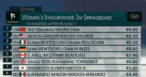 第一轮,施廷懋王涵,得到49.8分,位居第一名,意大利和美国选手并列第二;
